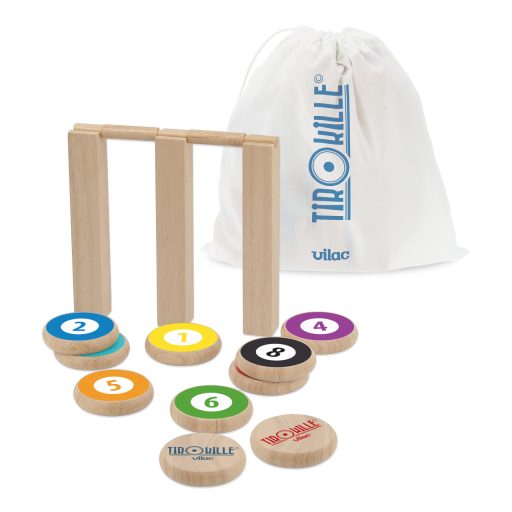 Egy doboz, négy játékmód: a kolkok, a pétanque és a shuffleboard legjobb elemei találkoznak ebben a sokoldalú, kültérre-beltérre is bevethető készletben. 2–8 játékosnak ajánlott. A masszív fa elemek (8 számozott korong, 2 speciális korong, 4 részes kapu) hosszú távon bírják a lendületes dobásokat. A cél játékmódtól függően: ledönteni az akadályt, a legközelebb gurítani, vagy átjuttatni rajta a korongot. Fejleszti a célzást, a mozgáskoordinációt és a taktikai gondolkodást; vászon tasakkal.