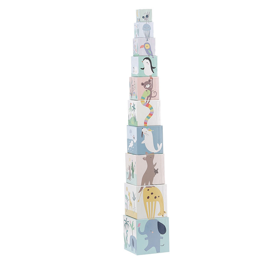 Sarah Betz illusztrált, 10 részes kartonkocka-készlete állatokkal és számokkal 1-től 10-ig. A kockákból 87 cm magas torony építhető, a játék eleinte rakosgatás, később számolás és párosítás lesz – együtt nő a gyerekkel. Fejleszti a koordinációt, a koncentrációt és a mennyiségfogalmat. Könnyen tárolható, környezetkímélő gyártás, pasztell színvilág. 2 éves kortól ajánlott.