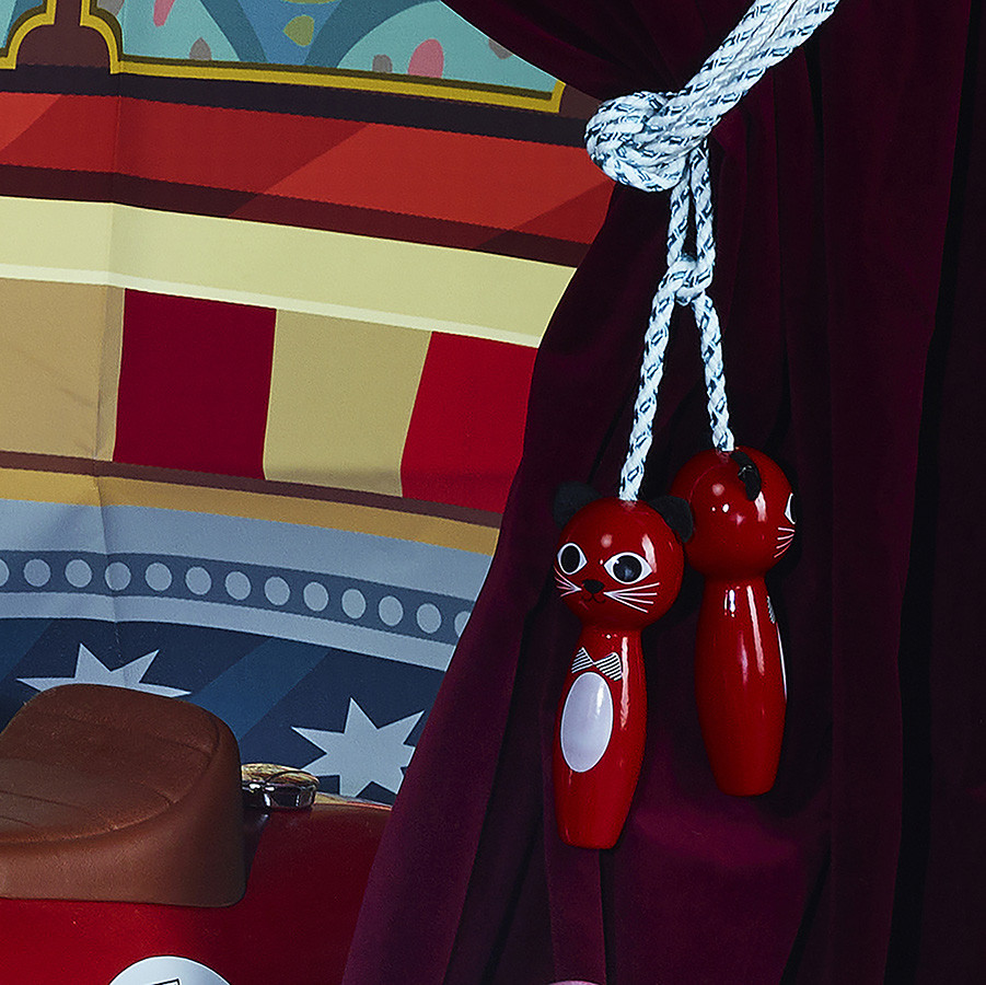Cuki cicás ugrálókötél Ingela P. Arrhenius illusztrációival. Állítható hossz, lakkozott fa markolatok. Főbb tudnivalók: 200 cm; Franciaországban készült; dizájn: Ingela P. Arrhenius.