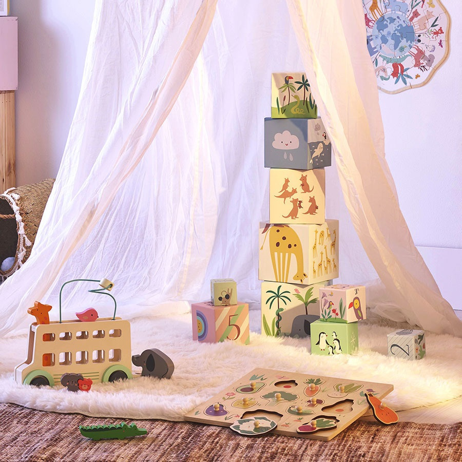 Interaktív, fa állatos busz Sarah Betz bájos illusztrációival. A gyerekek nyomhatnak, forgathatnak, tologathatnak – minden mozdulat új felfedezést hoz: hangot adó zsiráf, mozgó napocska, nyitható ajtó mögött kis állatbarátok (elefánt, koala, medve). Fejleszti a finommotorikát, a megfigyelést és a szókincset, Montessori-ihletésű korai készségfejlesztő. Strapabíró fa kivitel, dekoratív megjelenés, 18+ hónapos kortól.