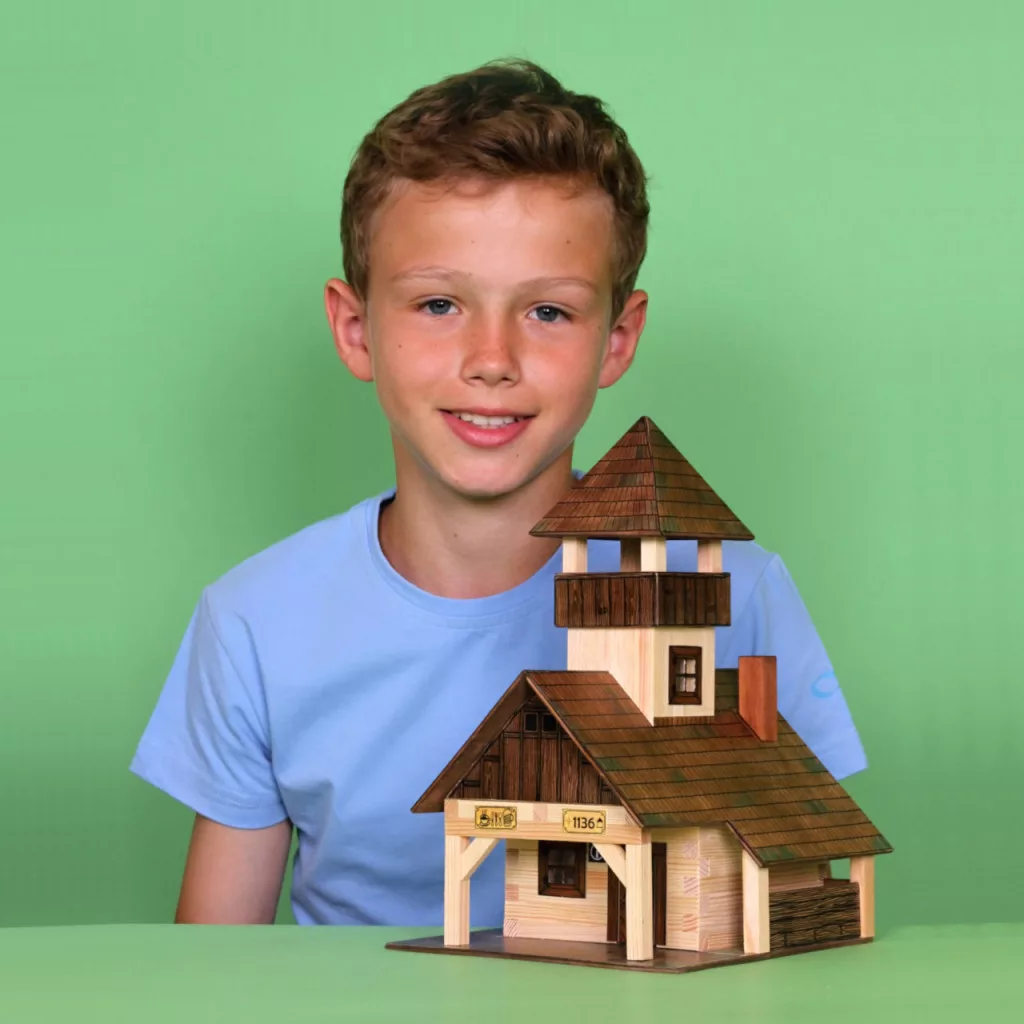 Az elemek ragasztással állnak össze, az építést pedig szemléletes útmutató támogatja. A fa alkatrészek igényes kidolgozása kellemes alkotást ad, a kész modell pedig dekorációnak is remek.