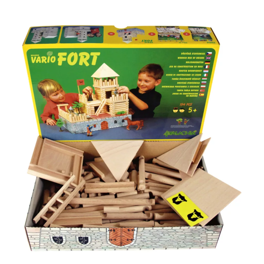 Ez a különleges Vario Fort készlet izgalmas építési élményt ad, hiszen a gyerkőcök egy saját kis erődöt vagy más változatos építményeket is létrehozhatnak. A gondosan megmunkált bükkfa elemek természetes hatásúak, tartósak és igazán örömteli alkotást kínálnak minden építéskedvelőnek.