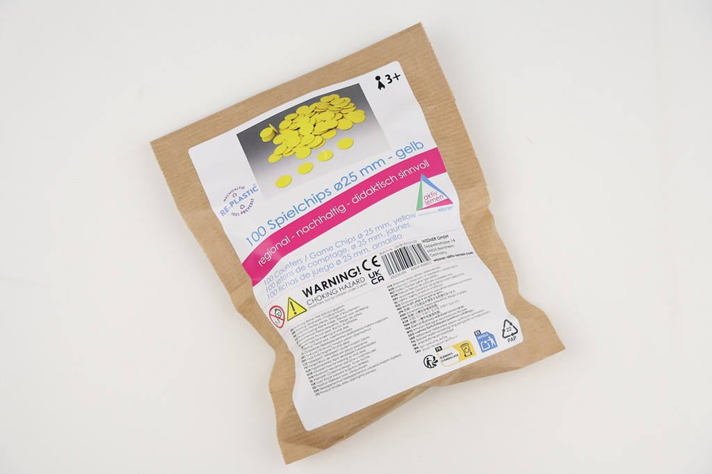 Univerzálne herné žetóny vhodné ako doplnok k spoločenským a výukovým hrám. Podporujú rozvoj porozumenia množstva, triedenia a porovnávania. Ideálne pre počítanie, bodovanie alebo vizuálne znázornenie úloh. Vyrobené zo 100% recyklovaného plastu, ktorý je po použití opakovane recyklovateľný. Zabalené v uzatvárateľnom papierovom sáčku s certifikáciou FSC. Hlavné vlastnosti: 100 žltých žetónovvhodné pre školské aj domáce použitierozvíja počítanie a vnímanie množstvavyrobené v Nemecku