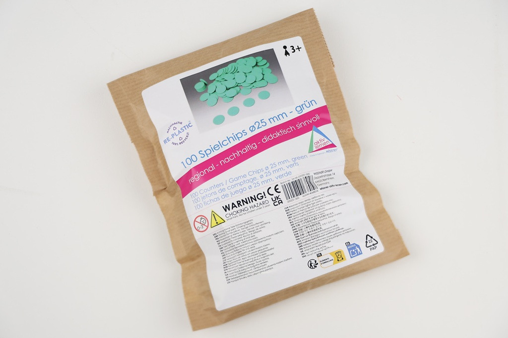 Univerzálne herné žetóny vhodné ako doplnok k spoločenským a výukovým hrám. Podporujú rozvoj porozumenia množstva, triedenia a porovnávania. Ideálne pre počítanie, bodovanie alebo vizuálne znázornenie úloh. Vyrobené zo 100% recyklovaného plastu, ktorý je po použití opakovane recyklovateľný. Zabalené v uzatvárateľnom papierovom sáčku s certifikáciou FSC. Hlavné vlastnosti: 100 zelených žetónovvhodné pre školské aj domáce použitierozvíja počítanie a vnímanie množstvavyrobené v Nemecku