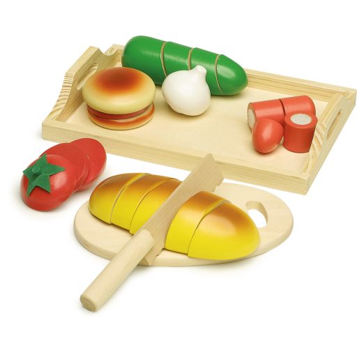 Poškodený obal. Nový tovar bez závad. Zábavná a zároveň náučná hračka pre malých kuchárov! Táto drevená krájacia sada obsahuje všetko potrebné na prípravu chutnej desiaty – chleba, uhorku, paradajku, cibuľu, párok a ďalšie dobroty.Jednotlivé diely sú spojené suchým zipsom, takže si deti môžu potraviny samy nakrájať dreveným nožom a znova zostaviť podľa svojej fantázie. Skvelý spôsob, ako rozvíjať jemnú motoriku, koordináciu oko-ruka a predstavivosť. Ideálny doplnok do detskej kuchynky! Sada obsahuje: 1 bochník chleba, 1 párok, 1 uhorku, 1 paradajka, 1 cibuľa, 1 hamburgerová žemľa, 1 karbonátok, 1 drevený nôž, 1 doštička, 1 tácka. Hlavné vlastnosti: krájacie potraviny z robustného drevadieliky na suchý zipsrozvíja kreativitu a nápaditú hruhravý úvod do sveta kuchyne a stravovania