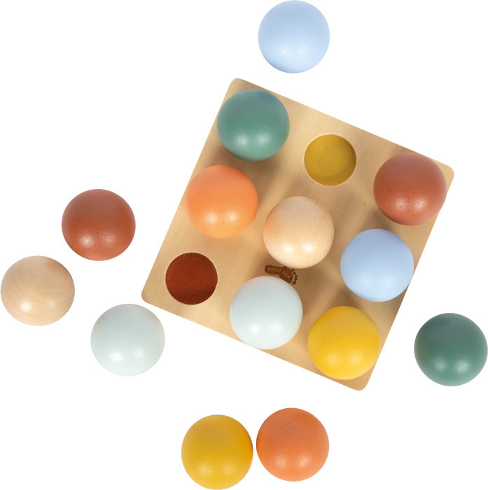 Skladanie, triedenie a objavovanie farieb - s touto Montessori hrou si deti hravým spôsobom rozvíjajú obratnosť aj kreativitu. Súprava vyrobená zo 100% dreva s certifikáciou FSC® sa skladá z pevnej základnej dosky s deviatimi priehlbinami a 14 hladkých drevených guličiek v jemných farbách. Stavanie pyramídy, triedenie podľa farieb alebo experimentovanie s vlastným usporiadaním cielene trénuje jemnú motoriku, sústredenie a koordináciu ruka-oko.Táto vzdelávacia hračka zaujme svojou jasnou štruktúrou a rozmanitými možnosťami využitia. Hladký povrch guličiek poskytuje príjemný zmyslový zážitok, zatiaľ čo voľné experimentovanie s rôznymi kombináciami podporuje logické myslenie a trpezlivosť. Vďaka svojmu nadčasovému dizajnu a dôrazu na rozvoj zručností je hračka ideálna pre domáce použitie aj do vzdelávacích zariadení. Hlavné vlastnosti: montessori triediaca hra so 14 farebnými guličkami a drevenou doskouzákladná doska s 9 farebne zladenými priehlbinami pre presné umiestňovanieguličky je možné triediť podľa farieb, skladať na seba alebo usporiadať do pyramídypodporuje vizuálne vnímanie, jemnú motoriku a koordináciu ruka-okoučia poznávanie farieb, základy počítania a pochopenia poriadku a štruktúryIšpiruje k experimentovaniu, kombinovaniu a kreatívnej hrehladký a hmatovo príjemný tvar guličiek je bezpečný pre detské rukyvyrobené zo 100% certifikovaného dreva FSC®   Značka a certifikát FSC® (Forest Stewardship Council) zaručuje, že drevo, z ktorého bol výrobok vyrobený, nebolo vyťažené nelegálne a pochádza z lesov obhospodarovaných šetrným či prírode blízkym spôsobom, v ktorom sú dodržiavané prísne environmentálne a sociálne požiadavky. Značka FSC® na výrobku znamená, že svojim nákupom pomáhate chrániť lesy a podporujete šetrné, zodpovedné či prírode blízke hospodárenie, vďaka ktorému sú naše lesy stabilnejšie, zdravšie, majú prirodzenú druhovú skladbu a lepšie odolávajú negatívnym následkom klimatických zmien.