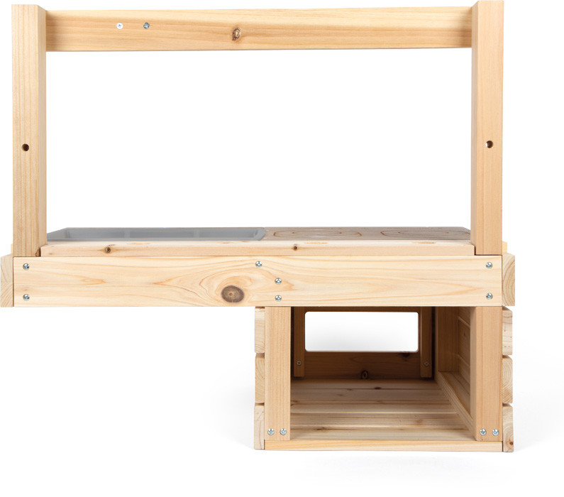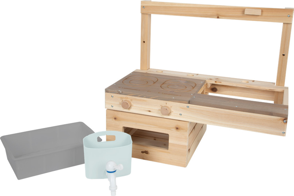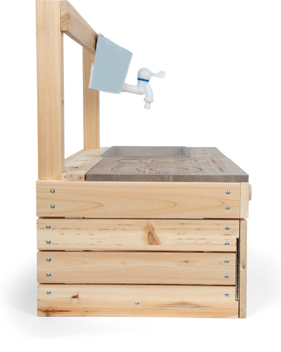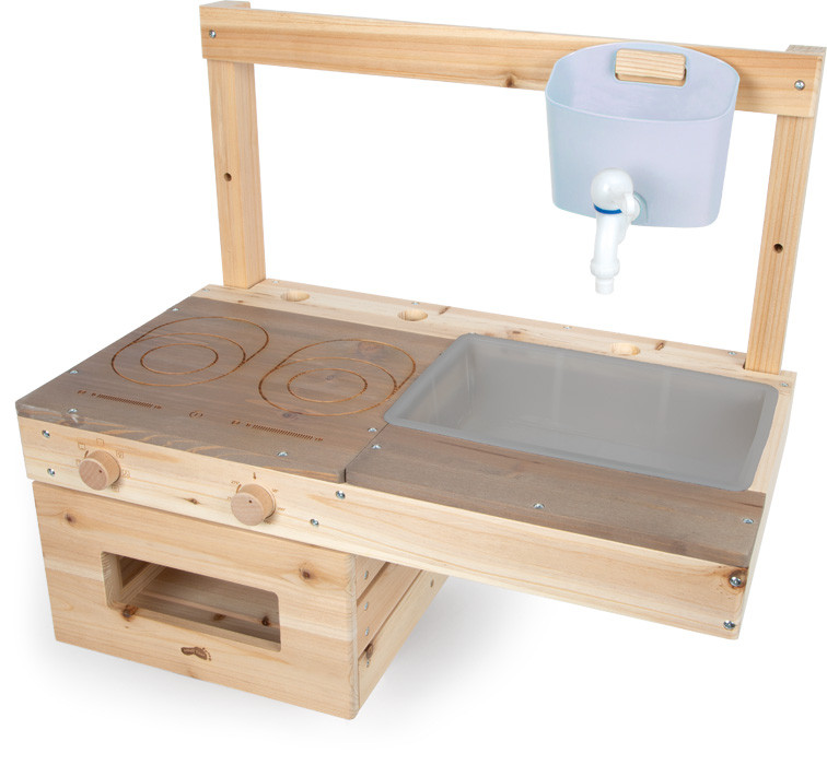 Inteligentné riešenie pre kreatívne kulinárske zážitky aj v tých najmenších priestoroch! Táto priestorovo úsporná vonkajšia kuchynka je vďaka svojej kompaktnej konštrukcii ideálnou voľbou pre menšie záhrady, terasy alebo detské ihriská. Môžete ju ľahko zavesiť na hernú zostavu, záhradný domček alebo akúkoľvek stenu a vytvoriť tak deťom štýlový herný kút. Kuchynka je vybavená varnou doskou s gravírovanými zónami a dotykovým ovládaním, praktickou rúrou s dvoma otočnými gombíkmi a nechýba ani závesný zásobník na vodu s funkčným kohútikom a drezom. Pracovná plocha je pre vyššiu odolnosť ošetrená náterom v kontrastnej farbe, ktorý podčiarkuje moderný vzhľad hračky. Vďaka praktickým výrezom v doske majú malí kuchári svoje varešky, klúčiky a ďalšie nevyhnutné náčinie neustále po ruke. Táto robustná konštrukcia umožňuje deťom naplno rozvinúť fantáziu pri varení z blata a vody bez toho, aby zaberala miesto na zemi. Lakovaný povrch pracovnej dosky poskytuje elegantný kontrast k prírodnému drevu a dodáva celku šmrnc. Aby vám kuchynka robila radosť čo najdlhšie, odporúčame neošetrené drevené časti ošetriť vhodnou impregnáciou. Upozorňujeme, že prvky na samotné upevnenie na stenu nie sú súčasťou dodávky. Hlavné vlastnosti: kompaktná kuchynka z neošetreného masívneho dreva v závesnom prevedenípracovná plocha s odolným náterom proti poveternostným vplyvomzávesná nádoba na vodu s funkčným kohútikom a vyberateľným drezomvybavená varnou doskou a rúrou vrátane gravírovaných ovládacích prvkov a otočných gombíkovurčená pre nástennú montáž na záhradné domčeky a ďalšie zvislé plochyrobustné a variabilné prevedenie, ktoré sa prispôsobí vašim potrebámideálne riešenie pre malé záhrady, terasy alebo balkóny