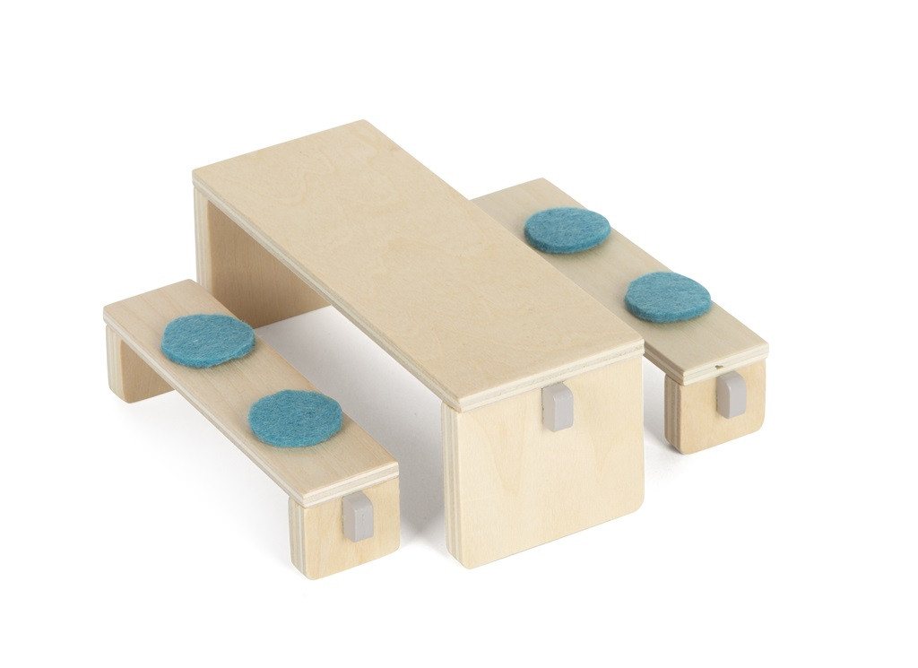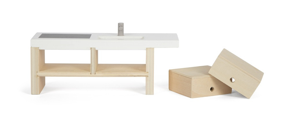 Kortárs konyha-szett rengeteg játéklehetőséggel: állószekrény hűtő-fagyasztóval és cserélhető karton hátlappal a saját dizájnhoz, szigetpult főzőlappal és mosogatóval, két kivehető fiók, étkező sarok visszatolható paddal, párnákkal és két székkel. Nyitható ajtók, sok funkció és társas szerepjáték - igazi találkozóhely a babacsaládnak. A berendezés közben fejlődik a kreativitás, a kézügyesség és a feladatszervezés.