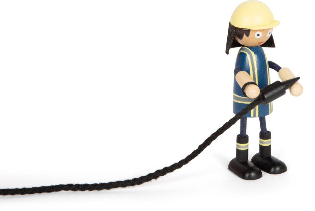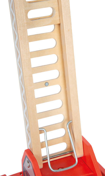 Riasztás! A nagyméretű fa tűzoltóautó pillanatok alatt szolgálatba áll. A 360°-ban forgatható, kihúzható kosaras létra mágnessel rögzül, a kitámasztók stabil alapot adnak. A visszahúzható mágneses tömlő és a hidrantszett, a kúpok és kordonelemek, valamint a nyitható rekeszek és a nyitható ajtós vezetőfülke (hajlítható figurával) élethű mentési jeleneteket tesznek lehetővé. Gumírozott kerekekkel csendesen gurul. Részletgazdag kialakítása kreatív, hosszú játékot garantál.